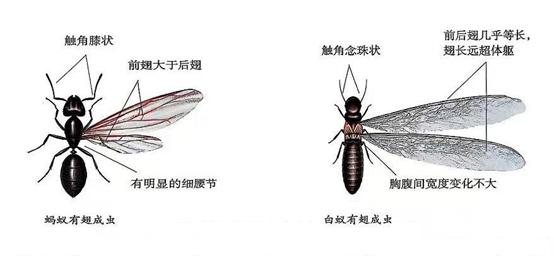 白蚁和蚂蚁外形相似,容易让人混淆,但实际上它们在分类学上完全不同——白蚁属于蜚蠊目,而蚂蚁属于膜翅目,二者并无亲缘关系。要快速区分白蚁和蚂蚁的有翅成虫,可以观察以下两个关键特征:一是翅膀长度。蚂蚁的翅膀长度接近或等于身体长度。白蚁的翅膀远长于身体,通常可达体长的2倍左右。二是翅膀是否易脱落。蚂蚁的翅膀不易脱落,即使触碰也不会轻易掉落。白蚁的翅膀容易脱落,轻轻一碰就可能脱离身体。