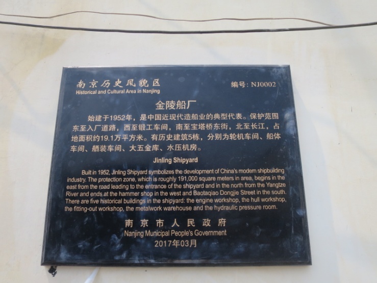 始建于1952年,是中国近现代造船业的典型代表。保护范围东至入厂道路,西至锻工车间,南至宝塔桥东街,北至长江,占地面积约19.1万平方米。有历史建筑5栋,分别为轮机车间、船体车间、舾装车间、大五金库、水压机房。