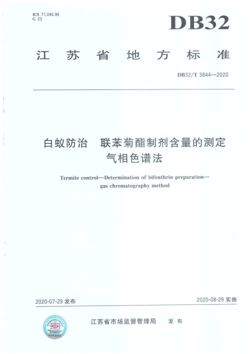 全国首创!江苏省地方标准《白蚁防治 联苯菊酯制剂含量的测定 气相色谱法》正式发布实施