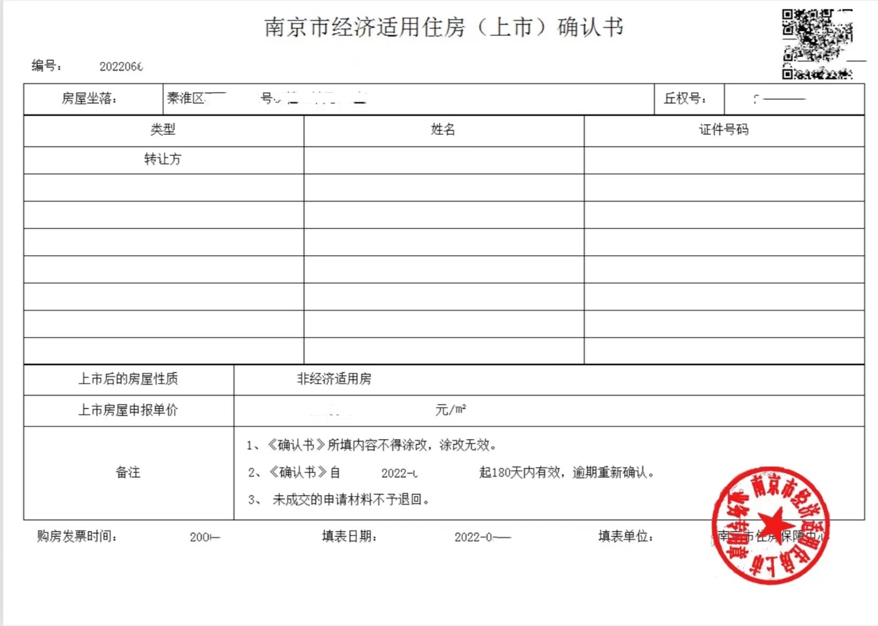 图一:电子版南京市经济适用住房(上市)确认书